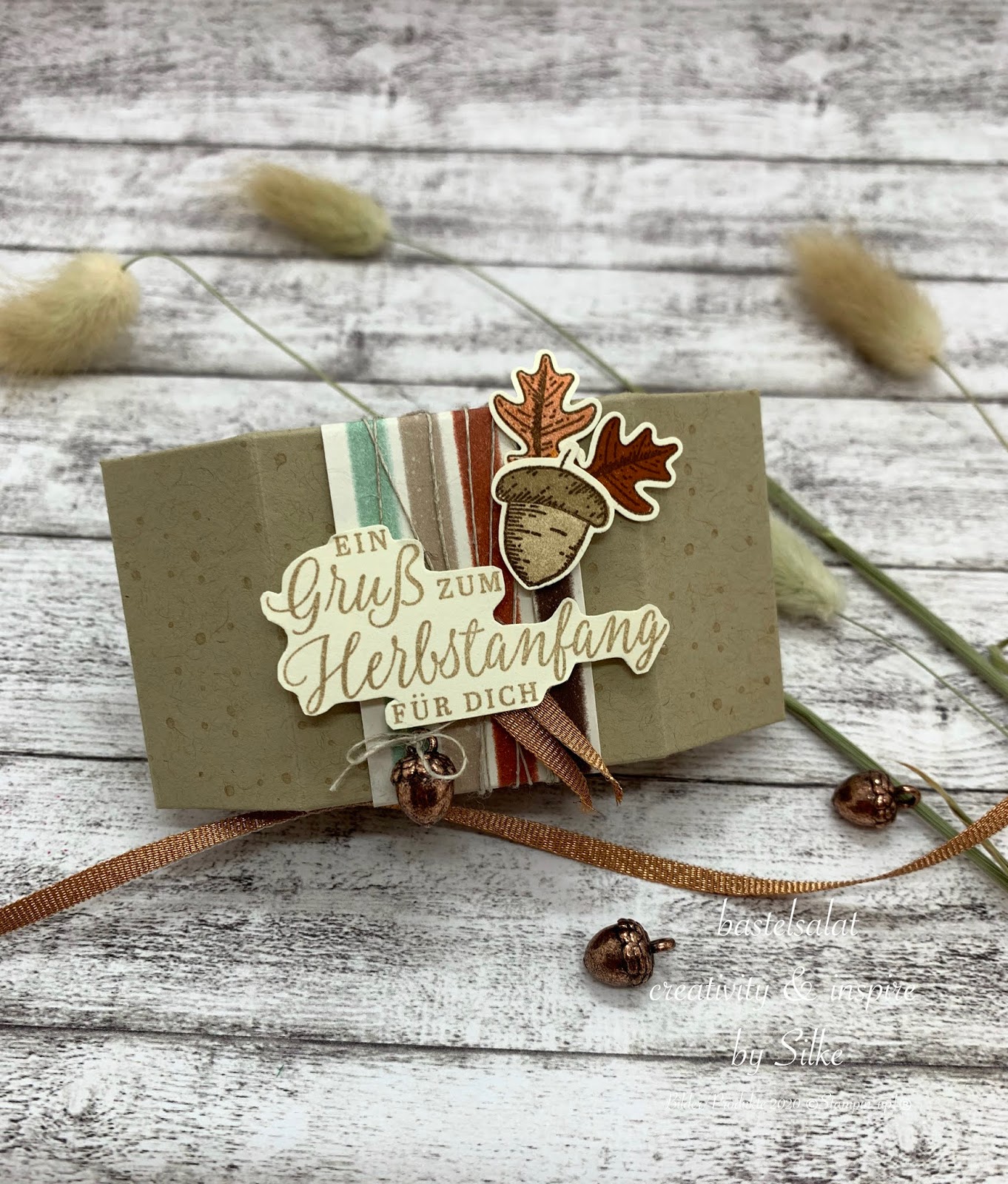 Für die Basis hab ich Farbkarton in Savanne verwendet und diesen mit einem Stempel aus dem Set In the Pines farbgleich bestempelt. Mit dem tollen Designerpapier Goldener Herbst ist die Banderole entstanden.