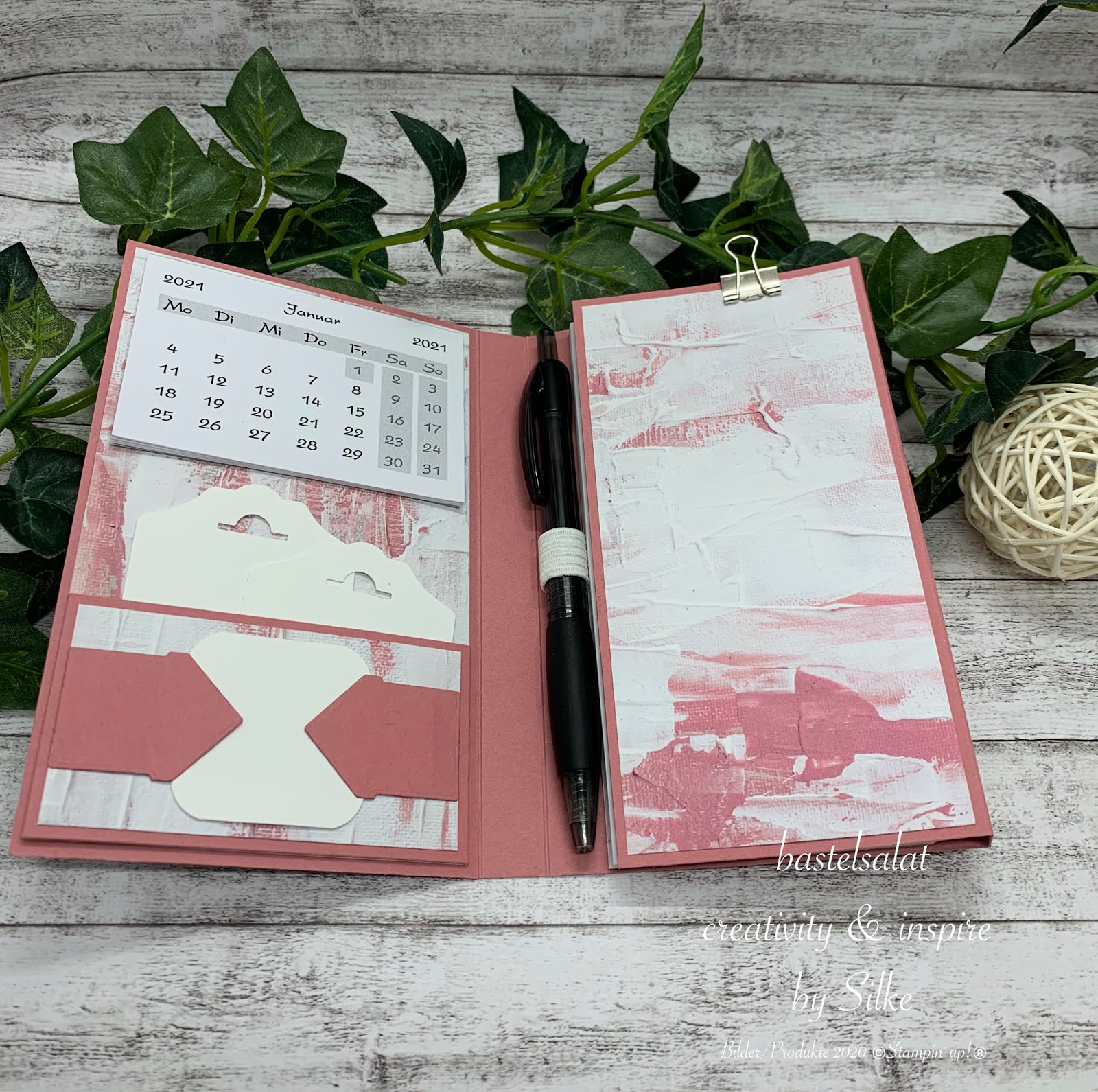 Was macht man wenn der Vorrat an Kellnerblöcken noch was herzugeben hat, die bestellten Minikalender für 2021 eingetrudelt sind? Man verkrümelt sich in sein Bastelreich und versucht beide Sachen hübsch zu verkleiden.