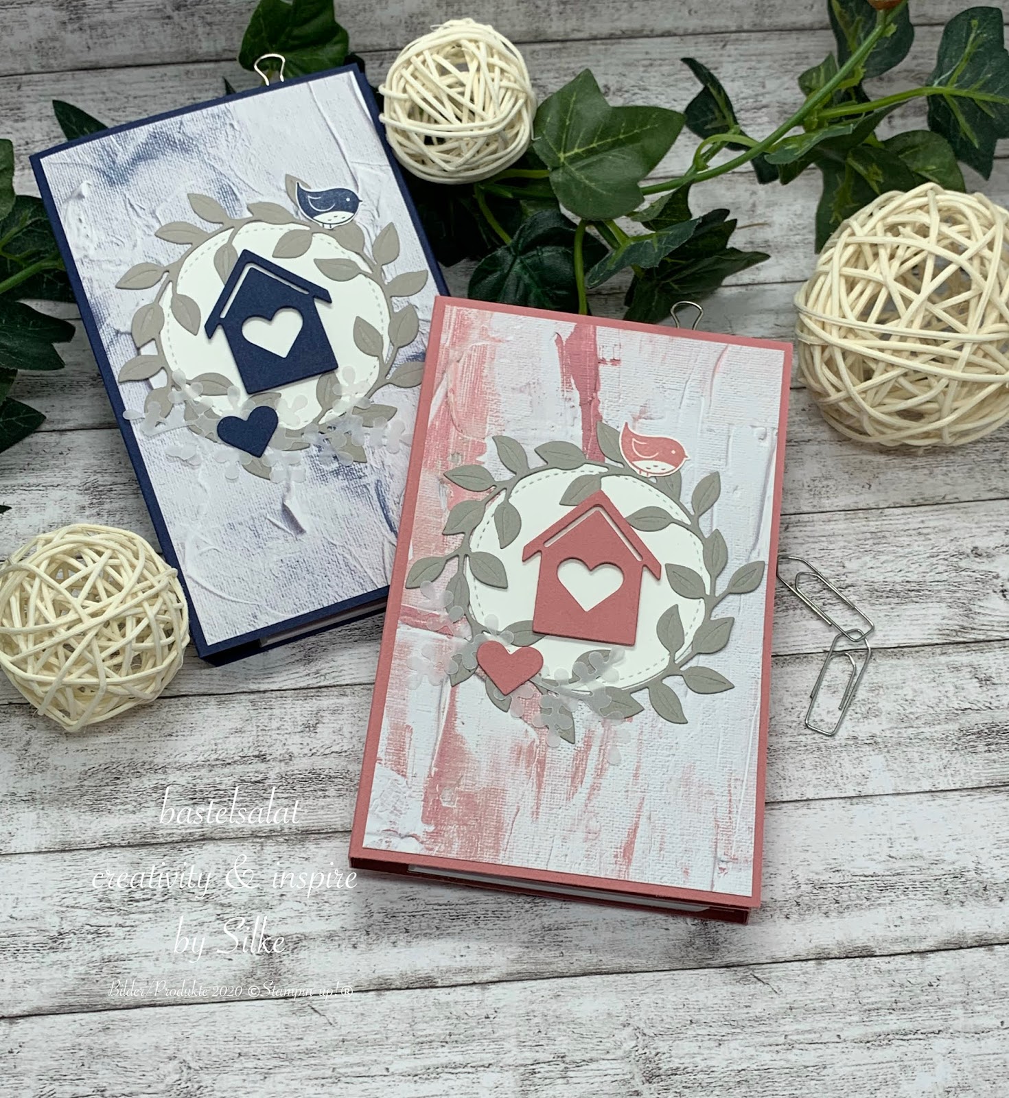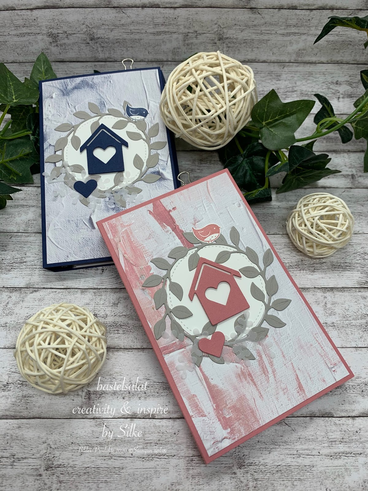 Bei allen beiden habe ich mit dem tollen Designerpapier „Ganz mein Geschmack“ gearbeitet. Hach, dieses Papier ist richtig klasse, Holzoptik, Strukturoptik, Steinwandoptik…. alles dabei. Aber auch die tollen Stanzformen Unser Zuhause, Schmück deinen Kranz und Stickmuster – welche ich Euch übrigens wärmstens empfehlen kann – kamen hier zum Einsatz.