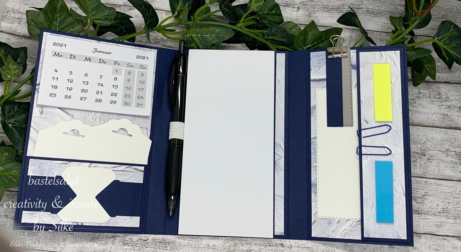 Von aussen relativ unscheinbar, kommt beim aufklappen ein Kalender, ein Kellnerblock, Postits, ein Kugelschreiber und zwei Einstecklaschen zum Vorschein.