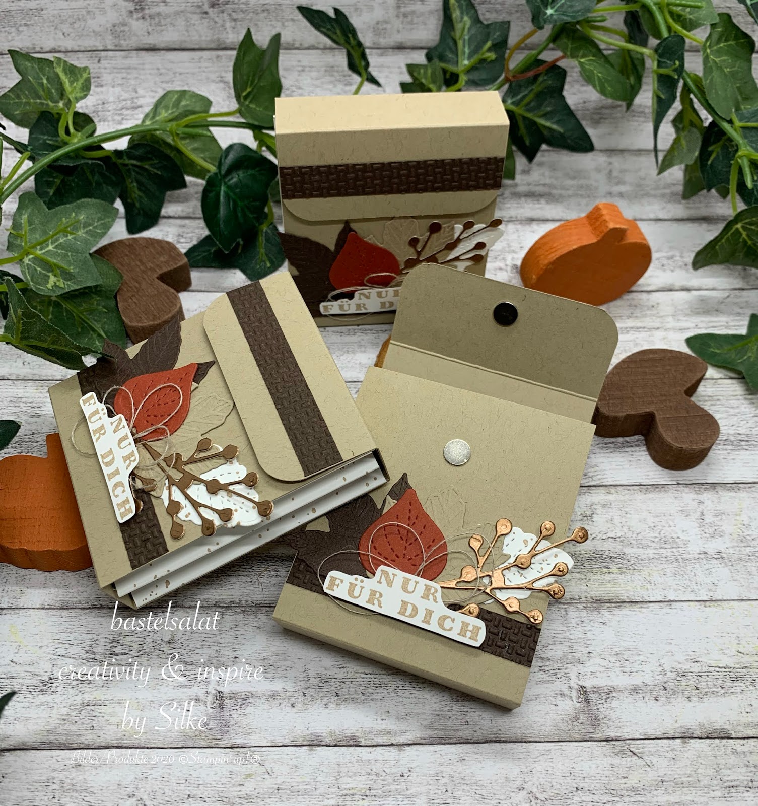 Dekoriert ist das ganze dann mit 2 kleinen Streifen Farbkarton in Espresso, welche mit einer der Prägeformen aus Tolle Texturen geprägt sind und einigen ausgestanzten Blättern.
