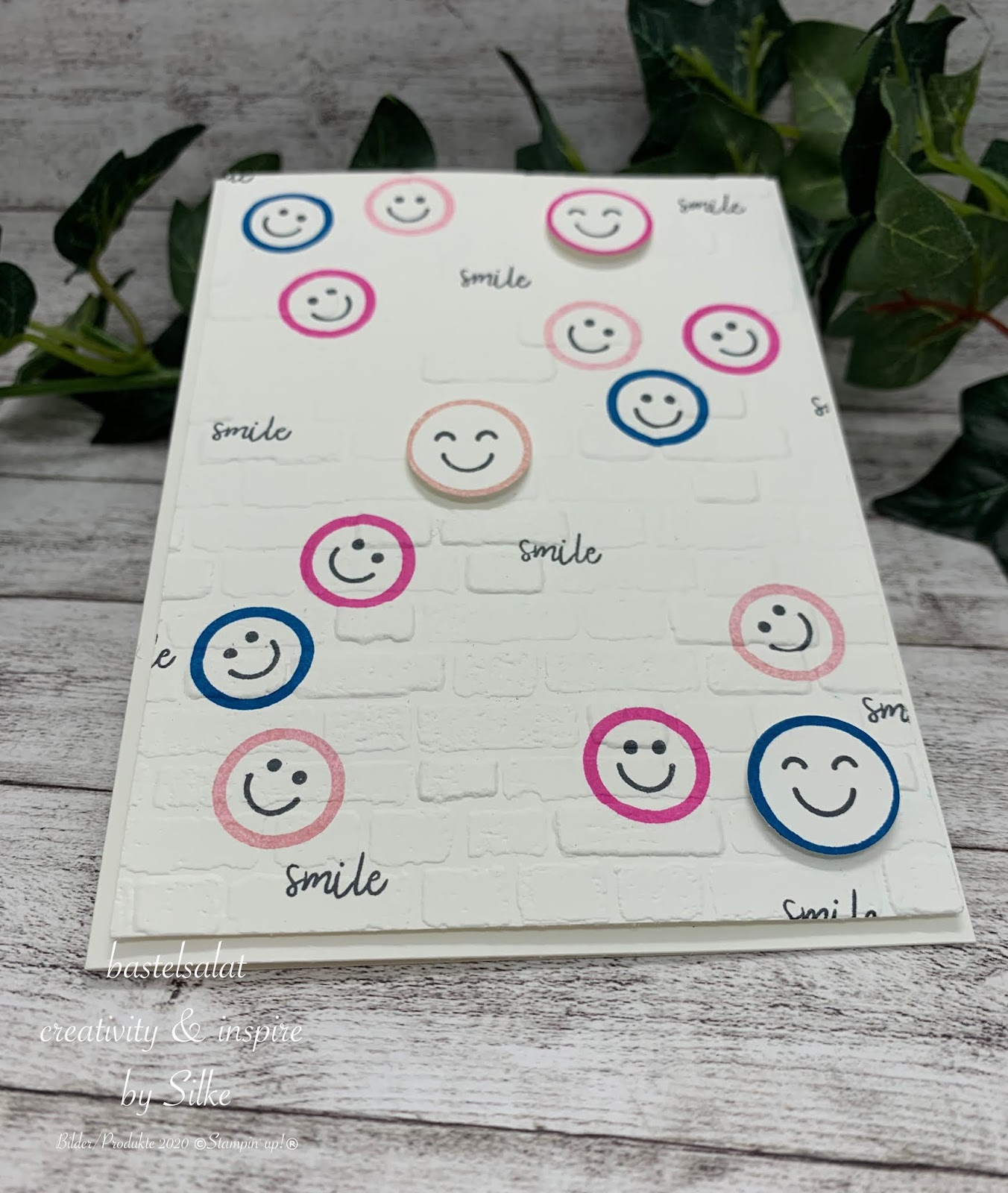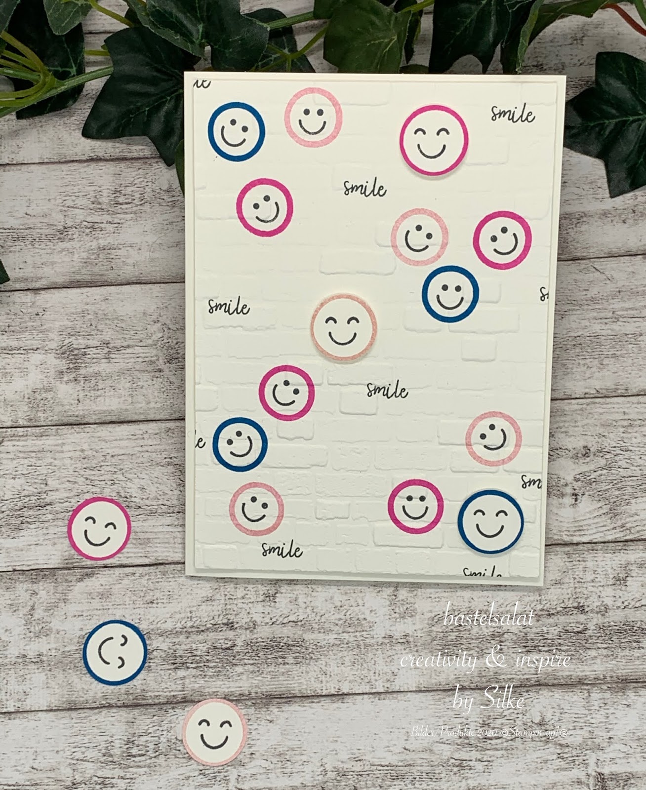 Die Smilies habe ich mit dem Stempelset Cute Fruit, woraus auch der kleine Textstempel stammt, gezaubert. Bevor der Flüsterweißen Layer mit der 3D Prägeform Mauerwerk durch die Stanz- und Prägemaschine gekurbelt wurde, habe ich diesen erst einmal mit den kleinen Gesichtern und dem süßen Spruch „smile“ bestempelt.