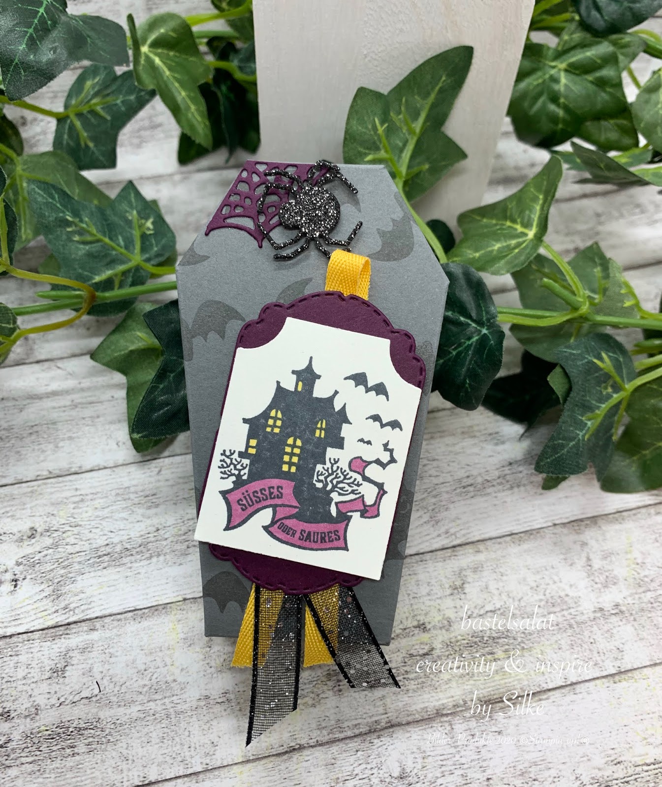 Das kleine Gruselschlösschen mit dem Spruch „Süsses oder Saures“ stammt aus dem Set Basic Für Feiertage und ist mit der Stanze Basic für Anhänger ausgestanzt. Unterlegt mit einem Brombeermousse farbigen Etikett, etwas glitzerndes Organdy Band und ein wenig von dem schönen Band in Currygelb peppen das ganze noch etwas auf.