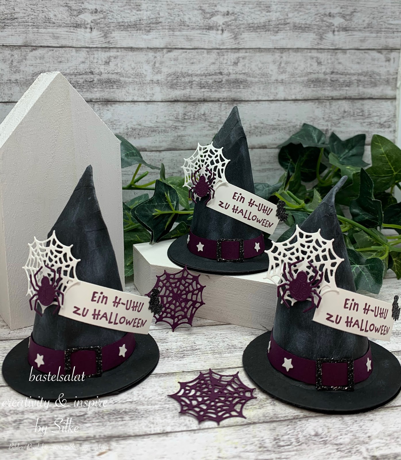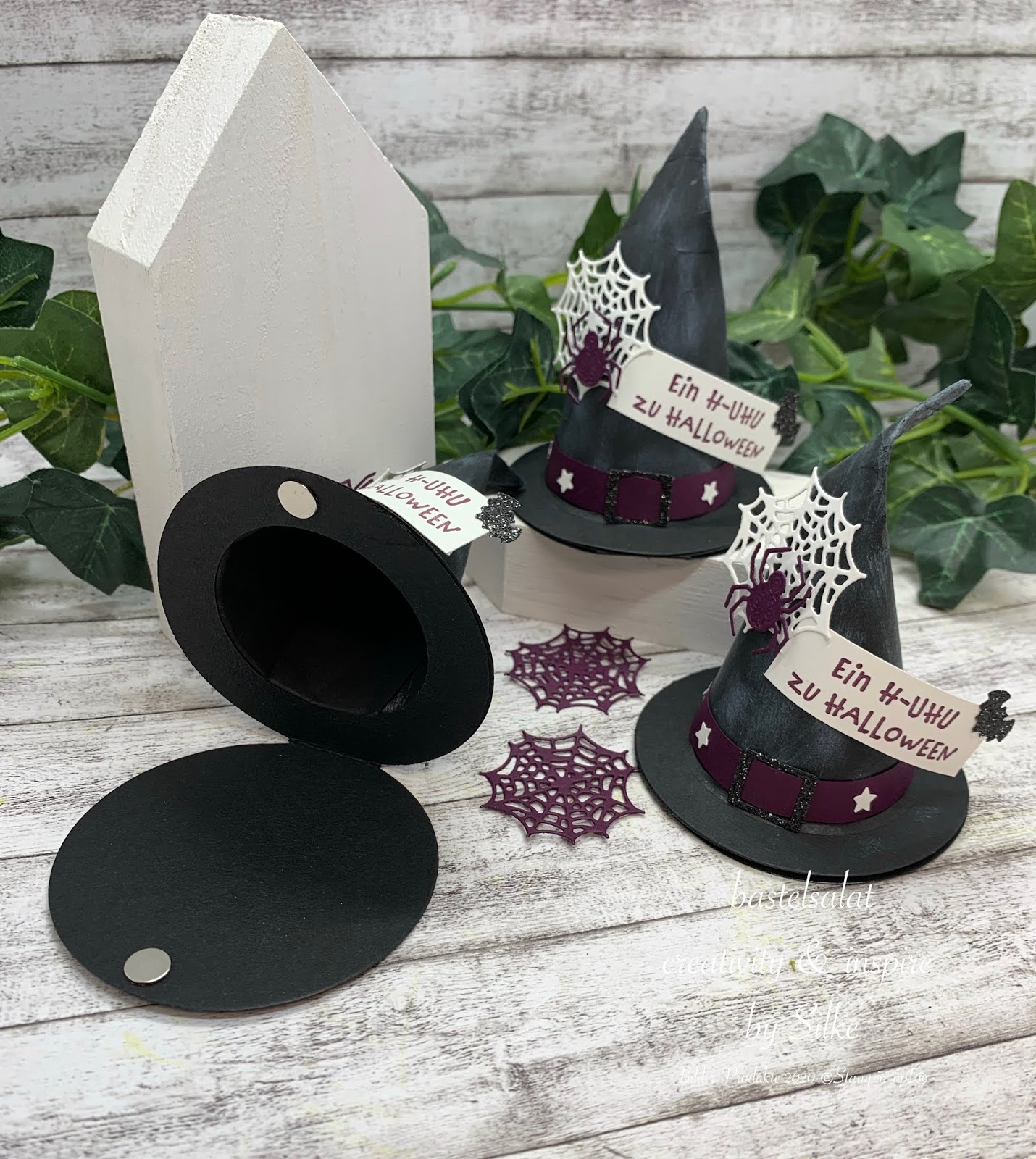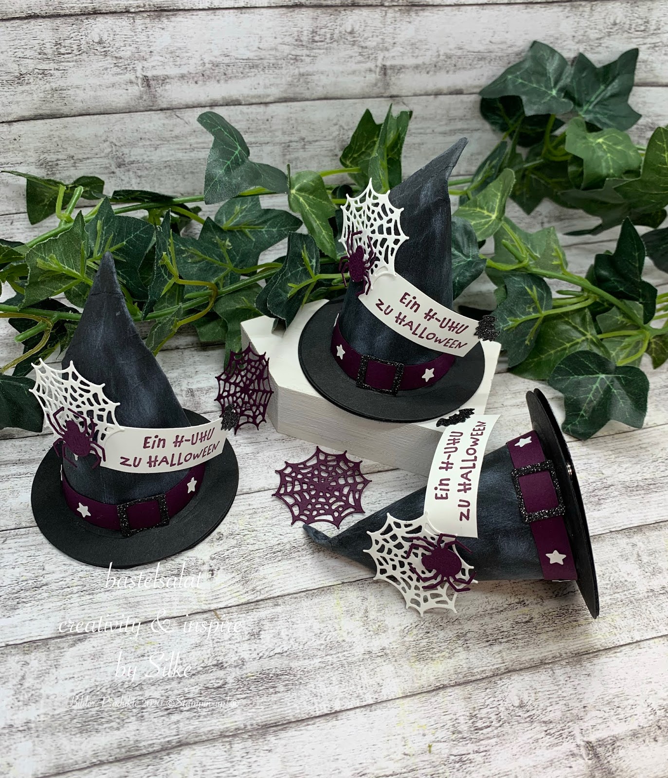 Wie Ihr ja bestimmt schon mitbekommen habt, habe ich mit Halloween ja nicht so viel am Hut, ich aber schließlich Herausforderungen liebe, mir auch zum Glück ein paar Ideen im Kopf herumschwirrten 😅, sind ein paar Süßigkeiten-Verpackungen in Form von Hexenhüten auf meinem Basteltisch entstanden.