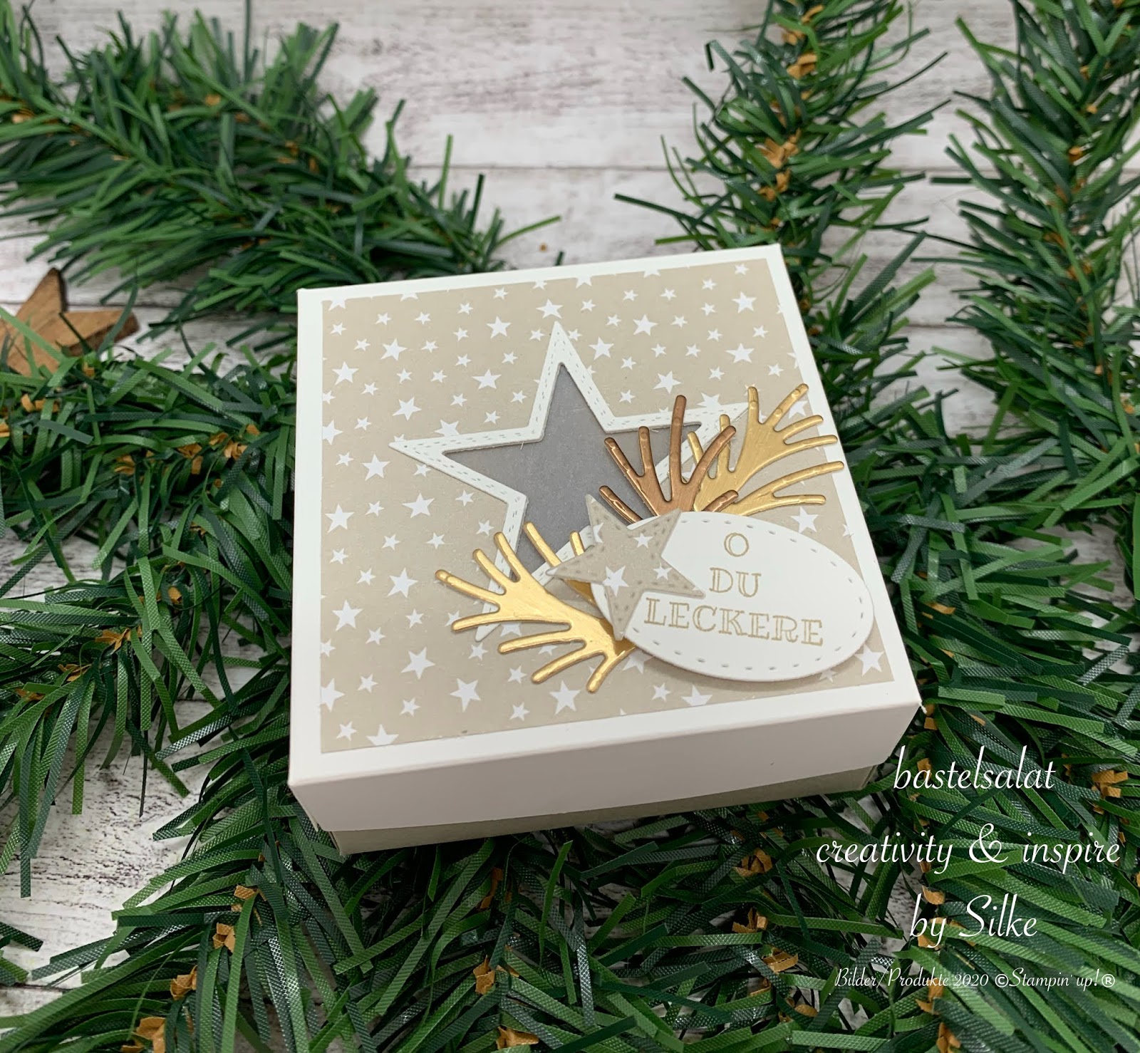 Bei der Dekoration habe ich die Stanzformen Mini-Zierschachtel und den tollen Farbkarton Matt-Metallic verwendet. Der süße Spruch findet Ihr in dem Stempelset Weihnachtsmix.