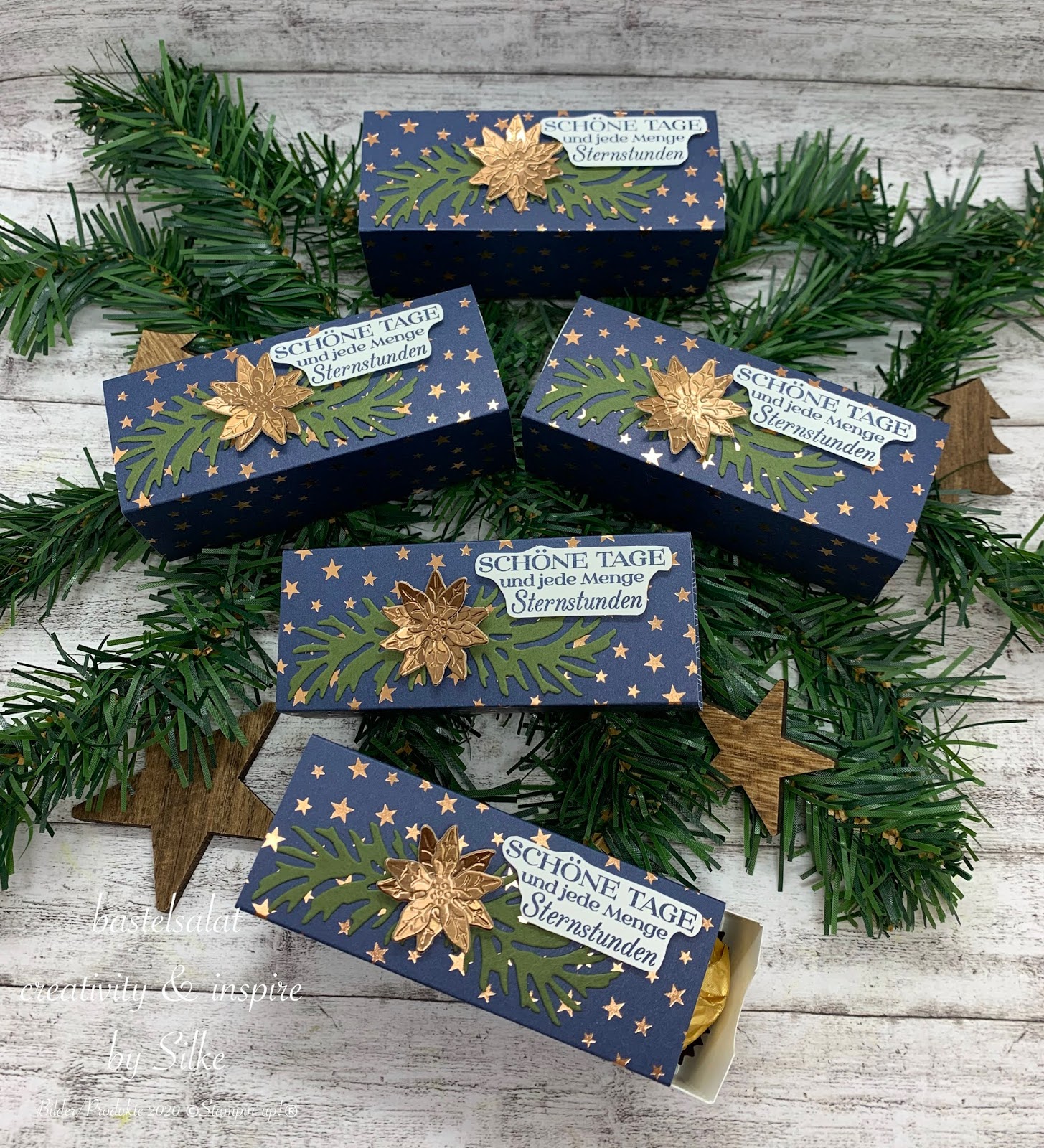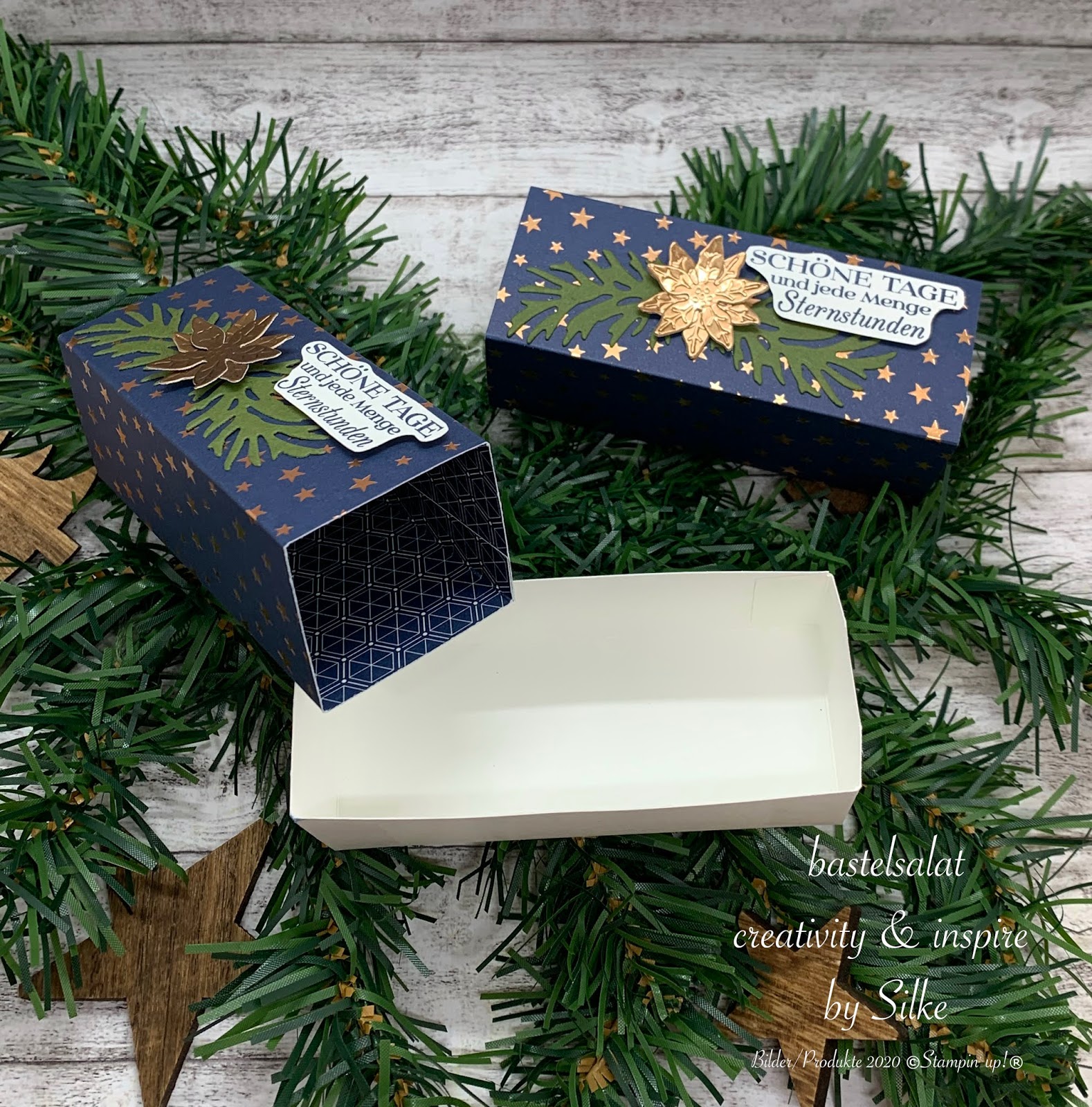 Dekoriert wurde das ganze dann mit ein paar ausgestanzten Tannenzweigen (Stanzformen Zauberhafte Zweige), einem kleinen in Matt-Metallic ausgestanzten Weihnachtsstern und einem Spruch aus dem Stempelset „Blühende Weihnachten“.
