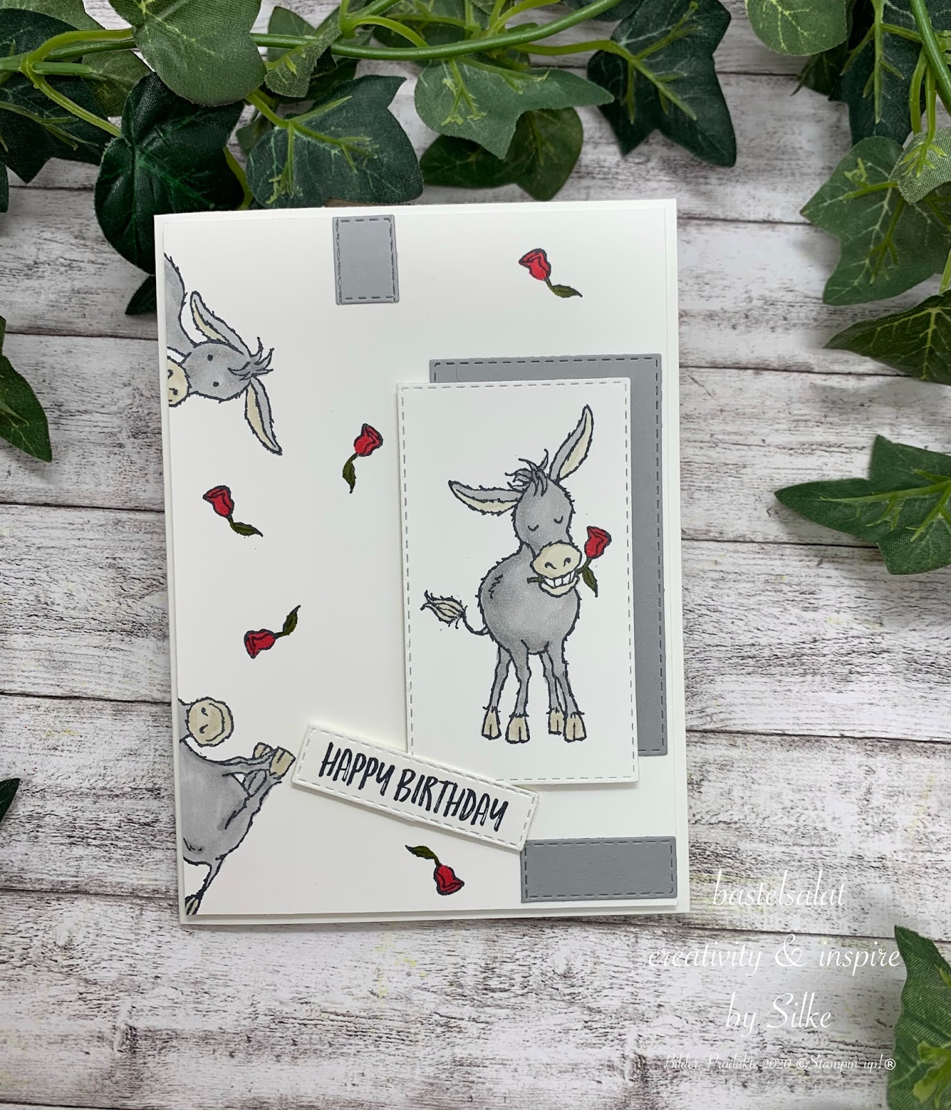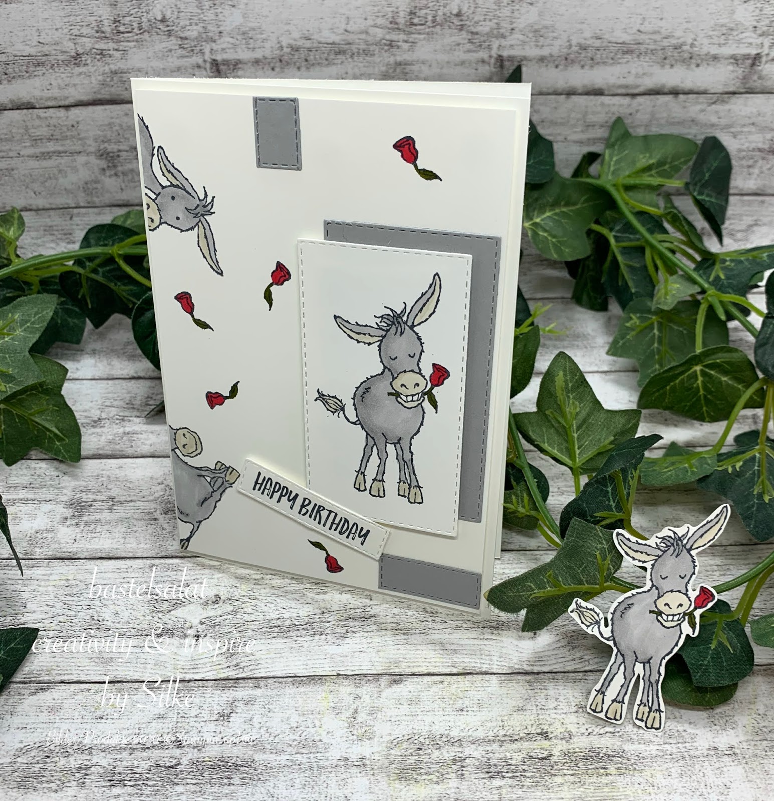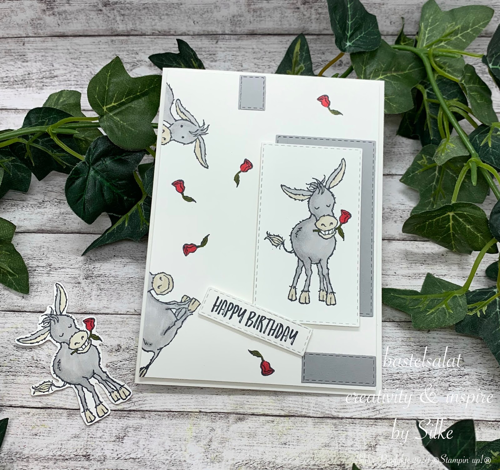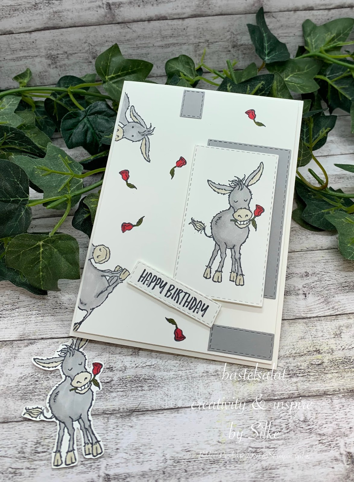 Bei mir hat es das Stempelset „Grüße auf Vier Hufen“ auch endlich mal auf den Basteltisch geschafft und ich habe damit dann direkt mal eine Geburtstagskarte gezaubert.