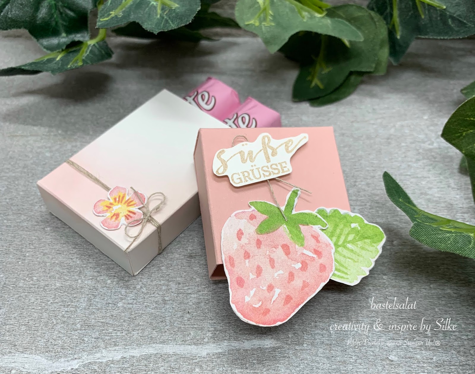 Ist dieser Aquarelllook von der Erdbeere, dem Blatt und der Blüte nicht toll? Mir gefällt er unheimlich gut 😍. Der Spruch stammt aus dem Set Beerenstark, ist in Savanne gestempelt, mit der Schere ausgeschnitten und mit Mini Dimensionals auf dem Oberteil der Verpackung befestigt.