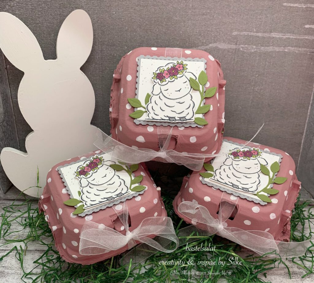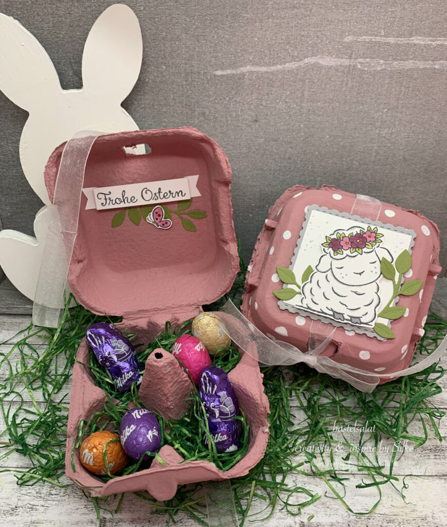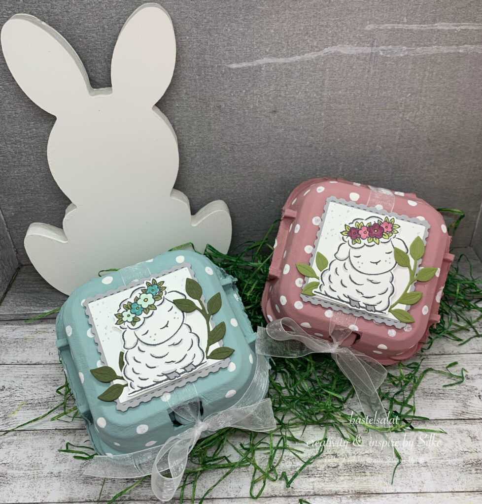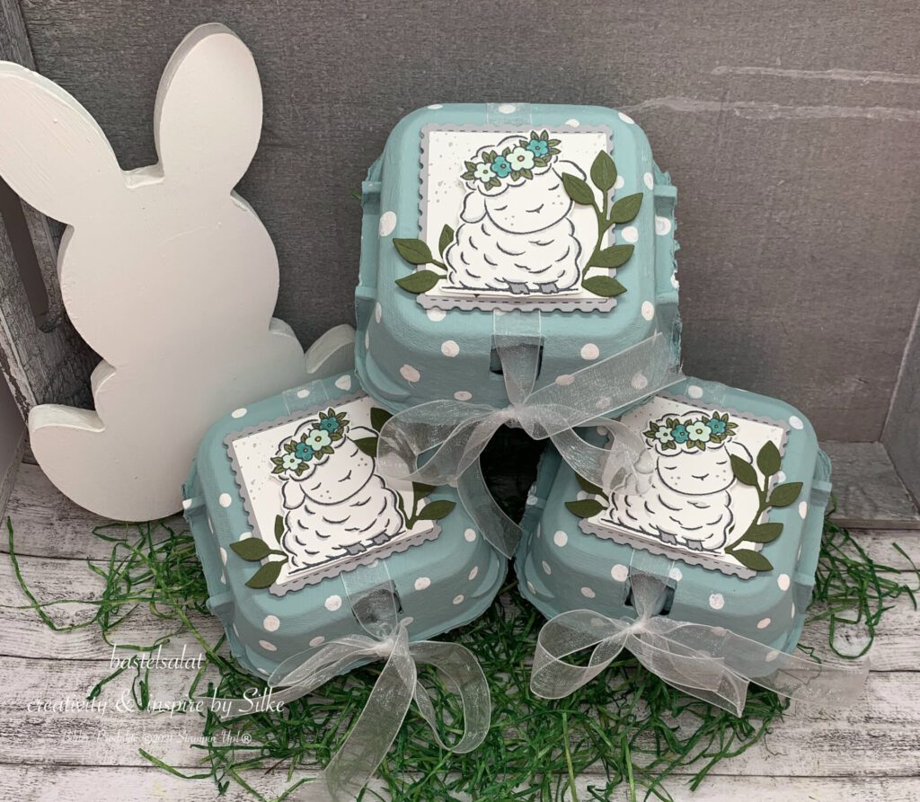 Das süße Lämmchen stammt aus dem Set Springtime Joy und ist farblich passend zum Eierkarton mit Blends coloriert.