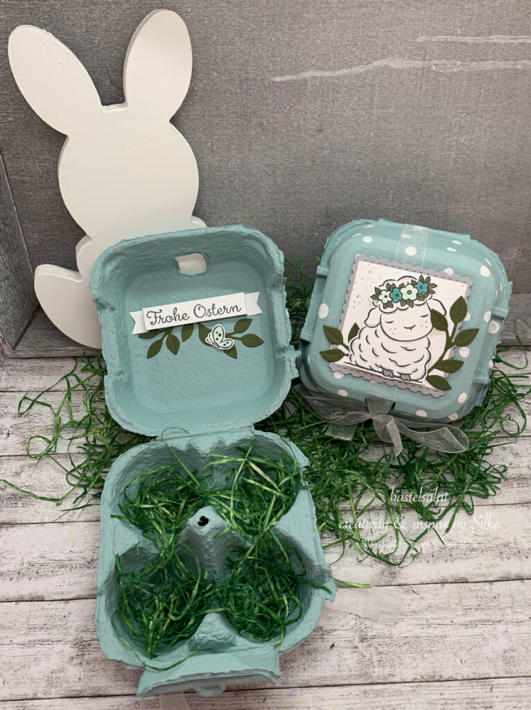 Im Eierkarton ist super viel Platz um darin ein kleines Osternest drin zu verstecken. Ein bisschen Ostergras hinein,