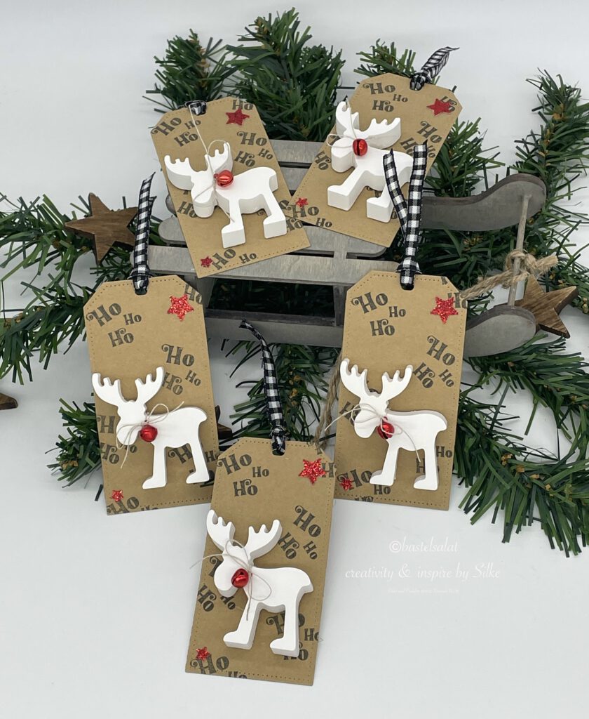 Aus Raysin 100 habe ich die kleinen, total süßen Rentiere (Gießform von der lieben Silke von Beton in Form) gegossen uns sie mit Dimensionals auf einen aus Kraftpapier ausgestanzten Anhänger befestigt.