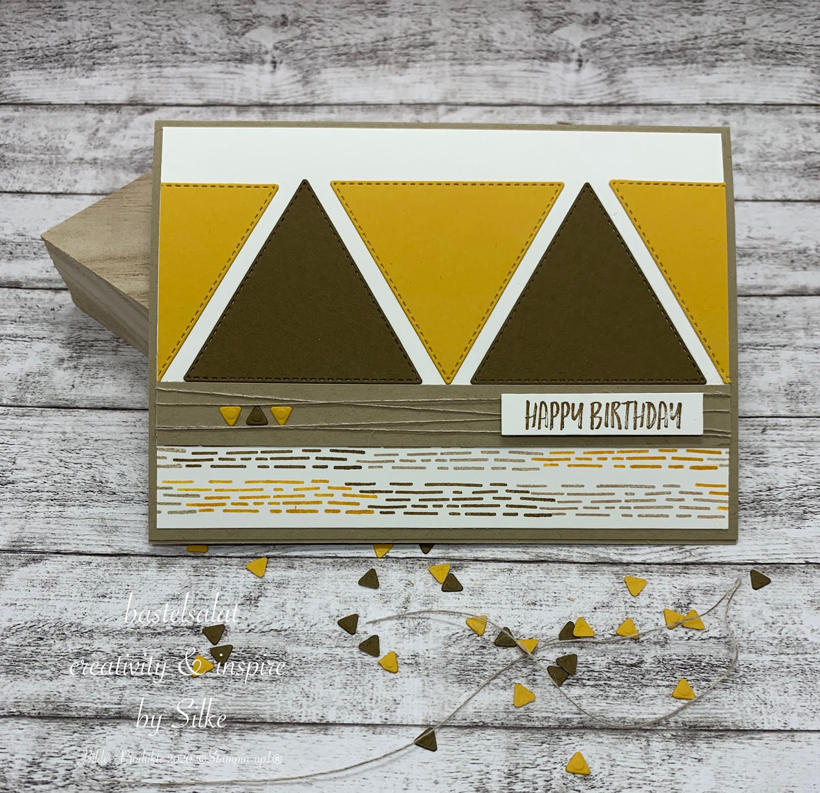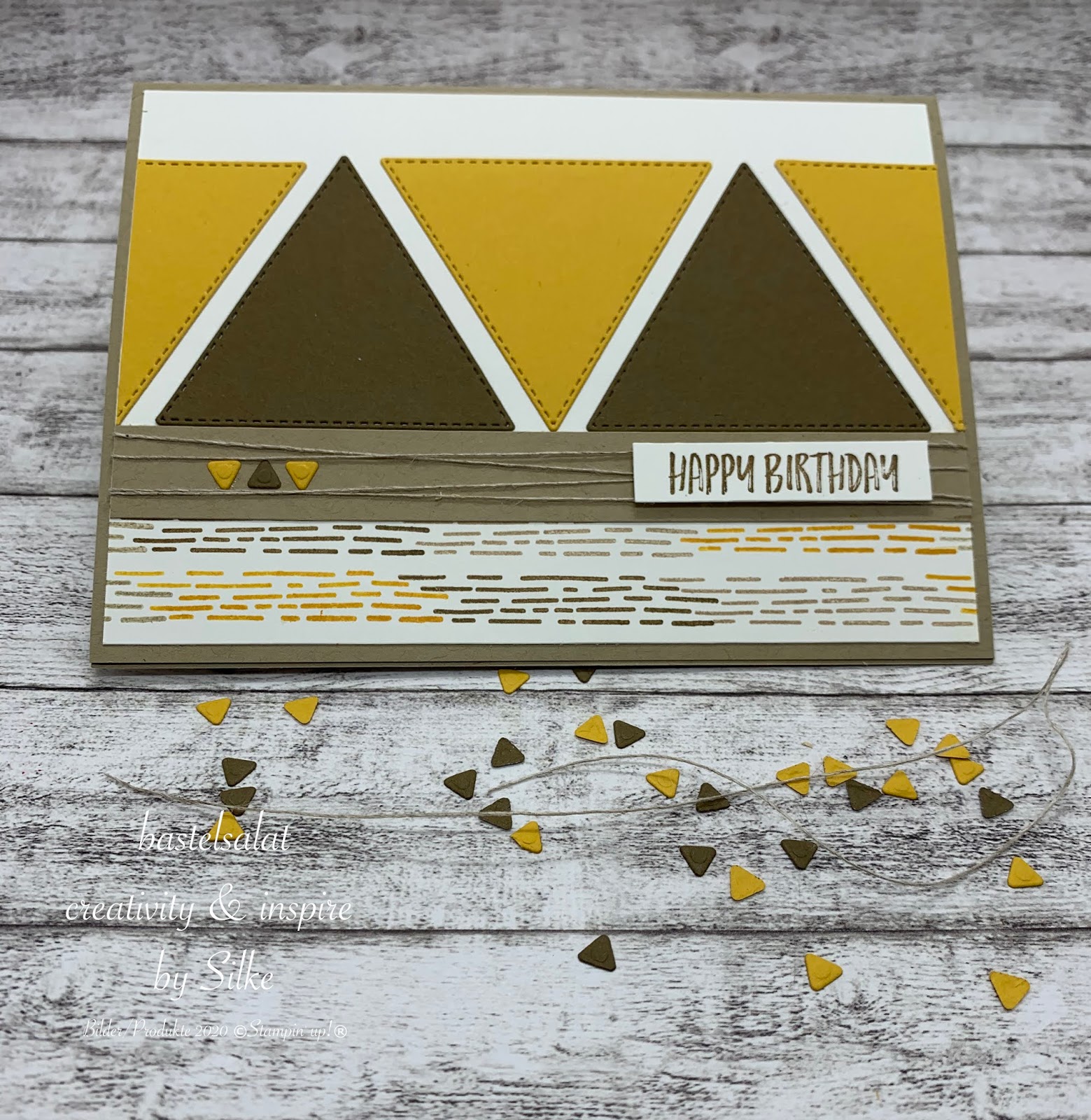 Das „Happy Birthday“ stammt aus dem Set „Zany Zebras“, ist in Wildleder gestempelt und mit Dimensionals auf der Karte angebracht. Anstatt Bling, Bling zum setzen kleiner Akzente zu verwenden habe ich dann einfach mal ein paar kleine, ausgestanzte Dreiecke genommen.