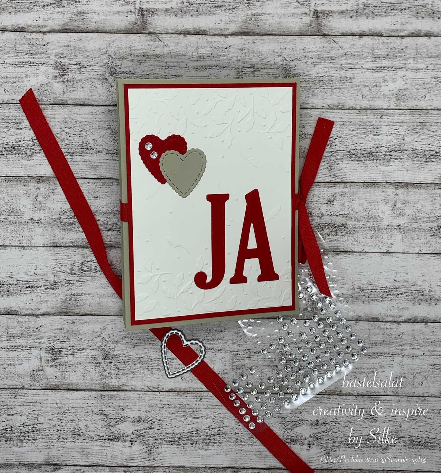 Die Saharafarbende Grundkarte ist mit Glutrot und Flüsterweiß kombiniert. Beim dekorieren/verzieren habe ich dann auch ein wenig die Tradition aufgegriffen und mit älteren (Stanzformen Große Buchstaben) sowie mit neuen Produkten (Prägeform Wiesenzauber) gearbeitet.