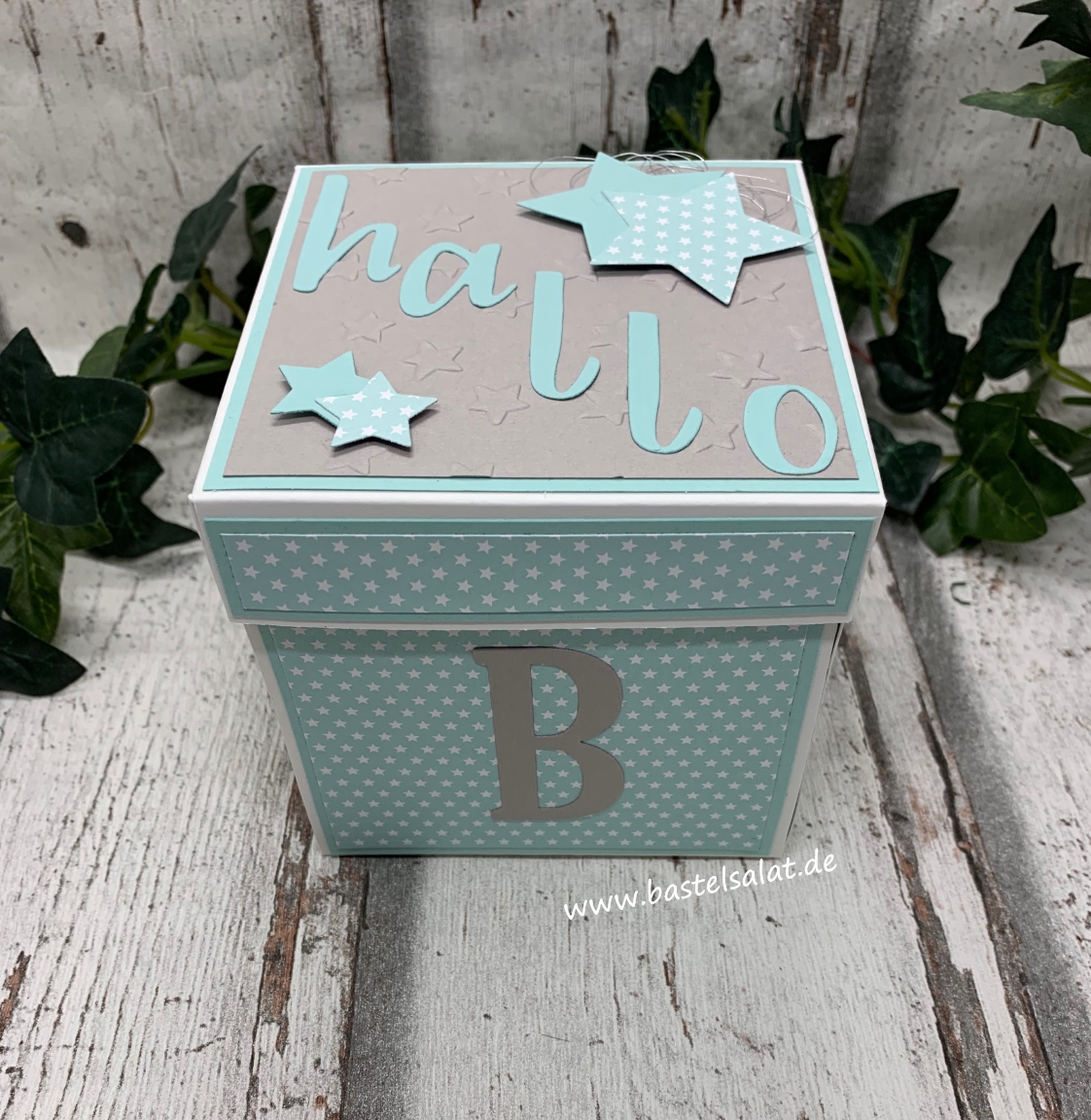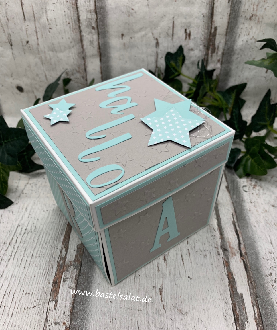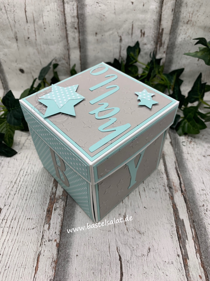 … des kleinen Jonas Christoph durfte ich eine Explosionsbox gestalten. Und da sie in der Zwischenzeit den glücklichen Eltern überreicht wurde, kann ich sie Euch nun auch zeigen.