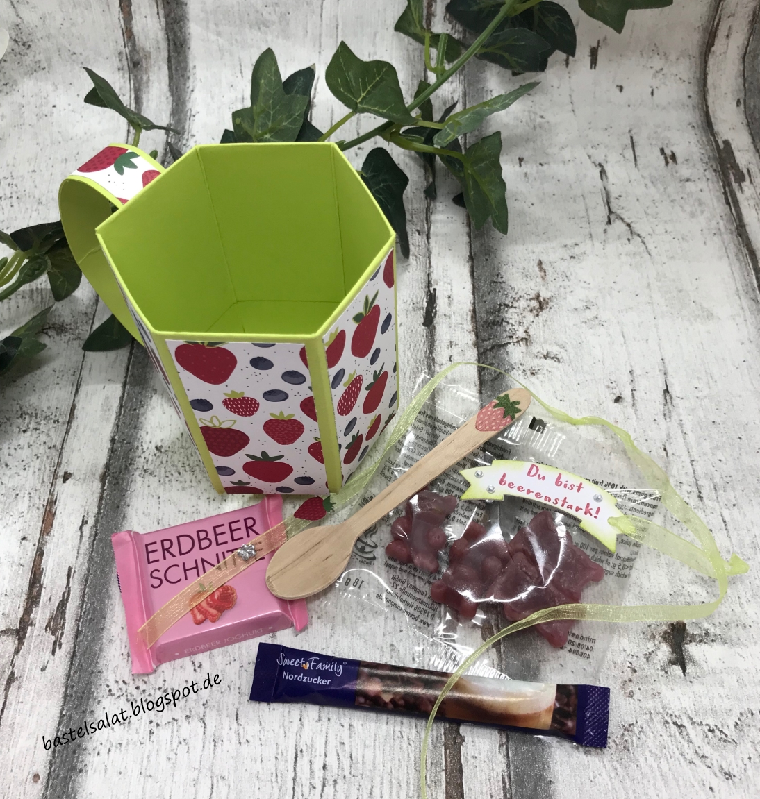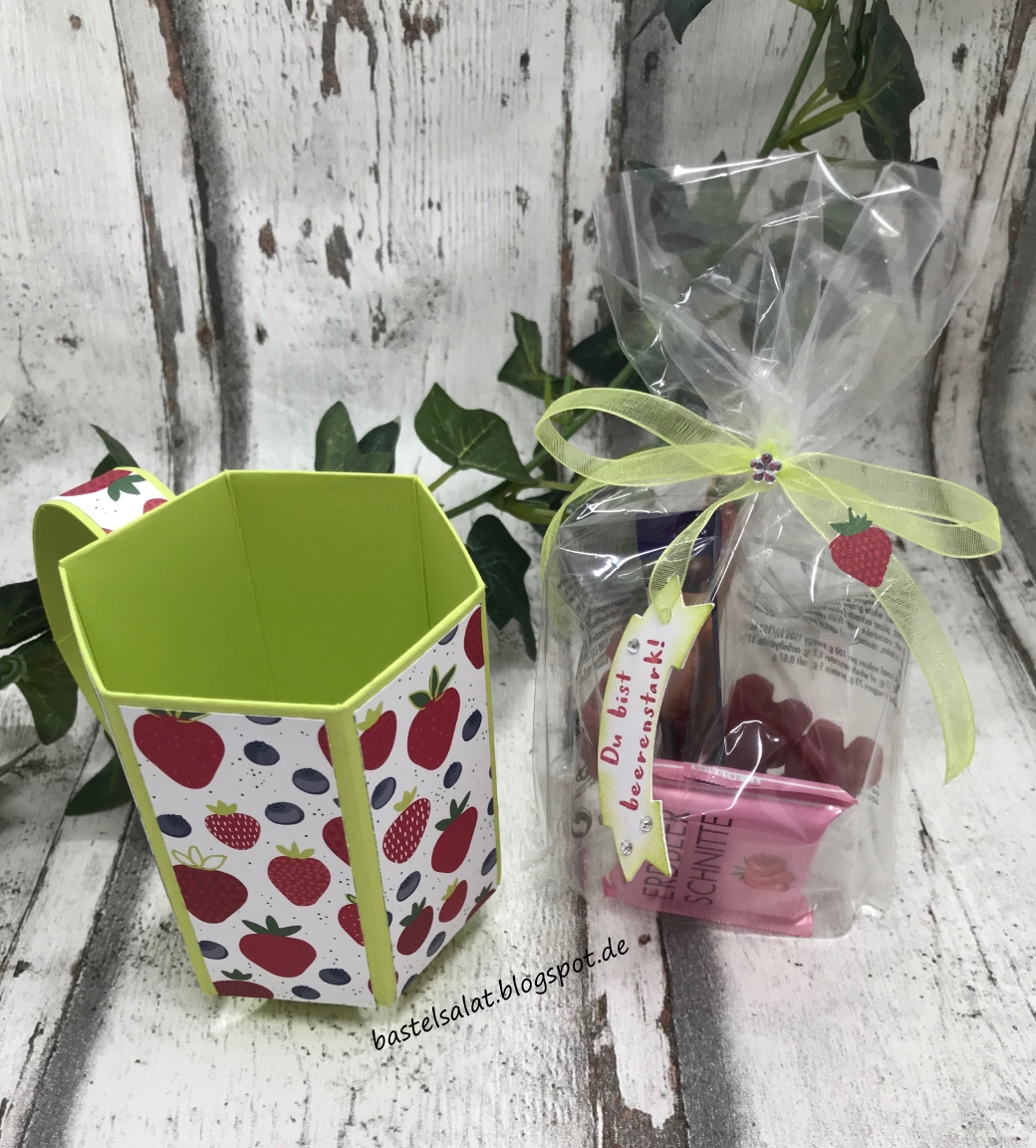 Bei der Herstellung der Tasse war das Schneide-/und Falzbrett, das Envelope Punch Board, die Bannerduo Stanze, die Erdbeerstanze aus dem Stanzpaket „Freche Früchten“, sowie das Stempelset „Gute-Laune-Korb“ im Einsatz.